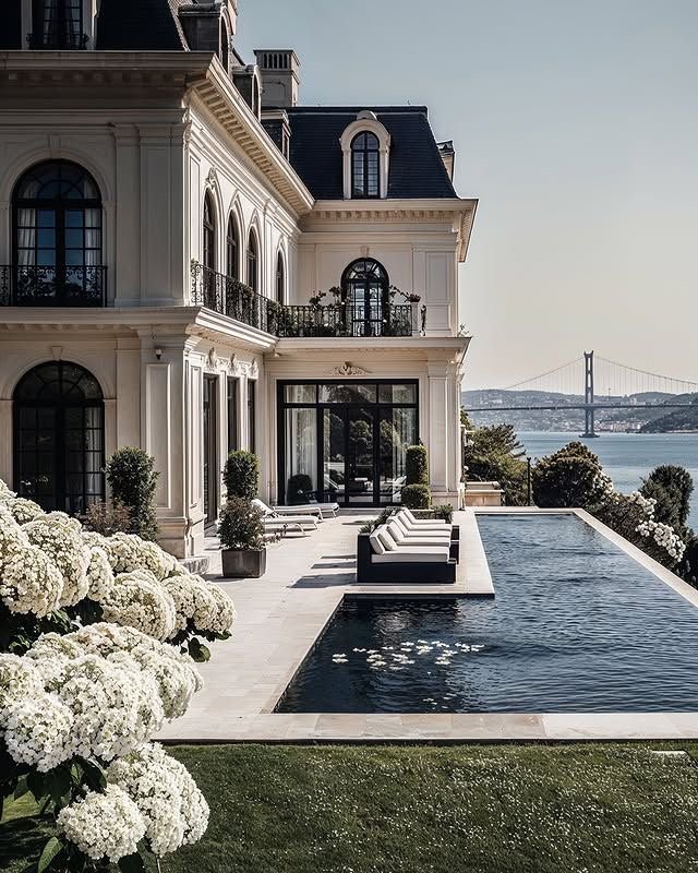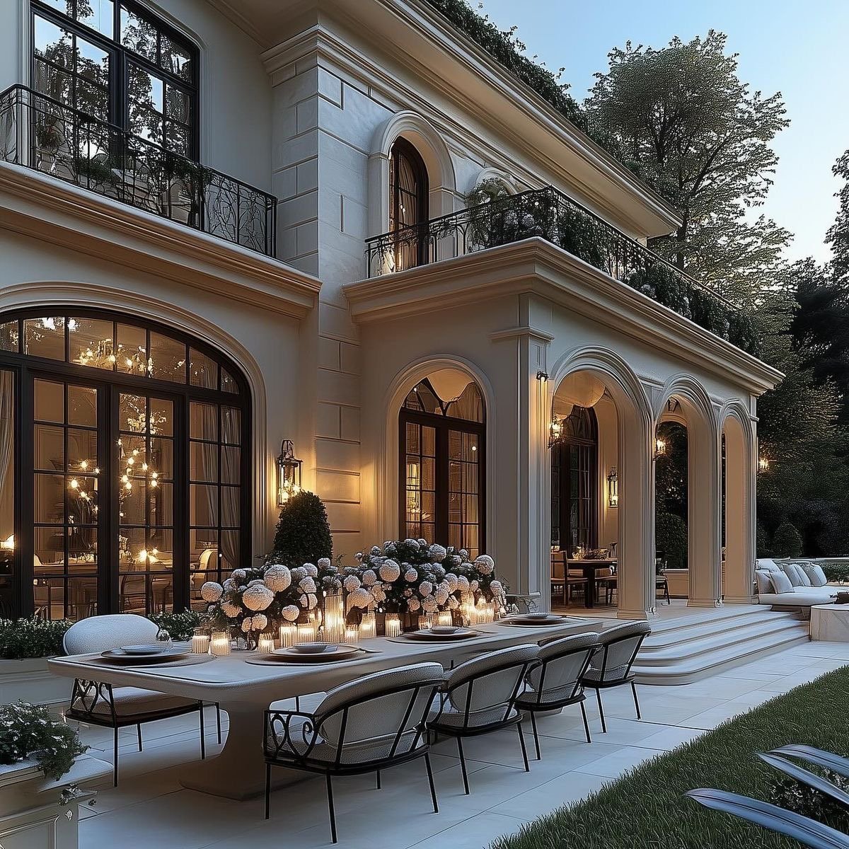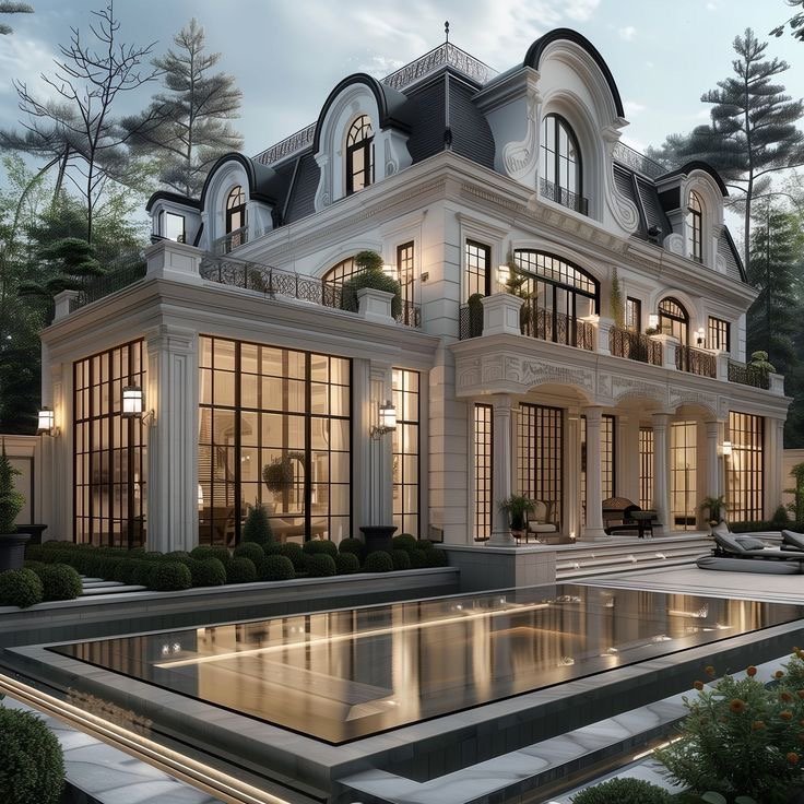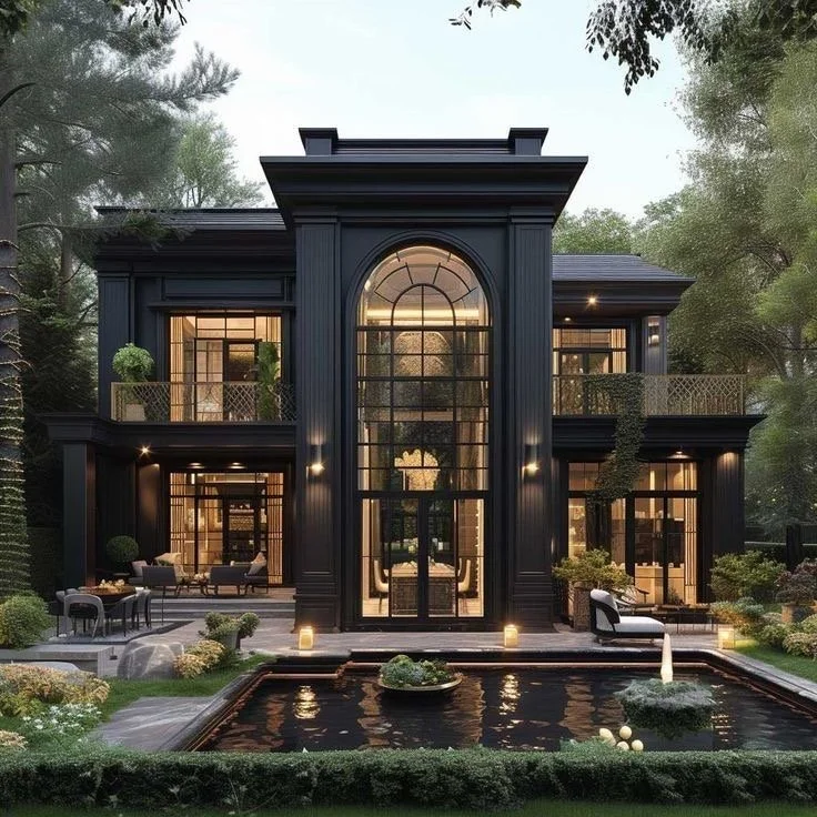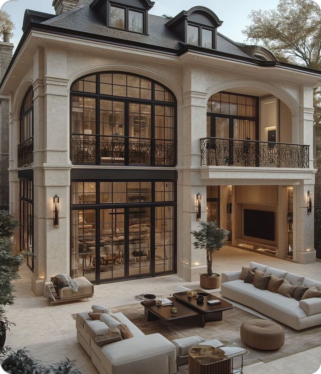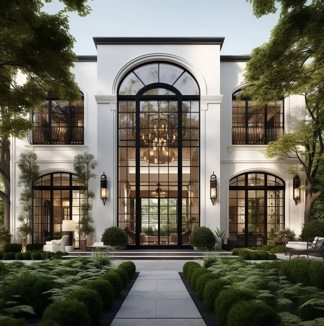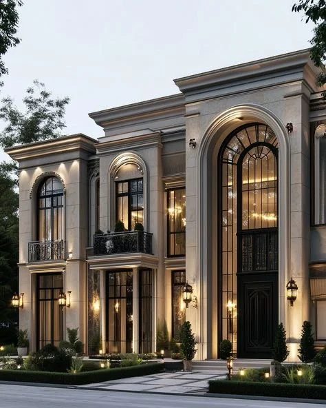 I get this request a lot from clients who want to respectfully renovate their homes but don’t know where to draw the line within the renovation as it relates to their home’s architecture. It’s definitely a line to be drawn from an architectural design standpoint. That intricate yet delicate trained line of balancing heritage or classicism with modernity. I’ve seen it done oh so beautifully, however, there are still some renovations that are unbelievably unbalanced and typically rely heavier on the modernity rather than fully embracing the architecture’s heritage, which is so unsettling in my opinion. I feel the urge to share a few tidbits on how to honor your home’s history while bringing it into today’s world with modern materials (exterior + interior) and subtle luxury. Let’s begin! Yeesss! This architecture is neoclassical revival with modern emphasis (peep the gorgeous windows, doors, arch, + balconies). This property is properly stunning utilizing lighting to highlight the asymmetry of the architecture….LOVE!
