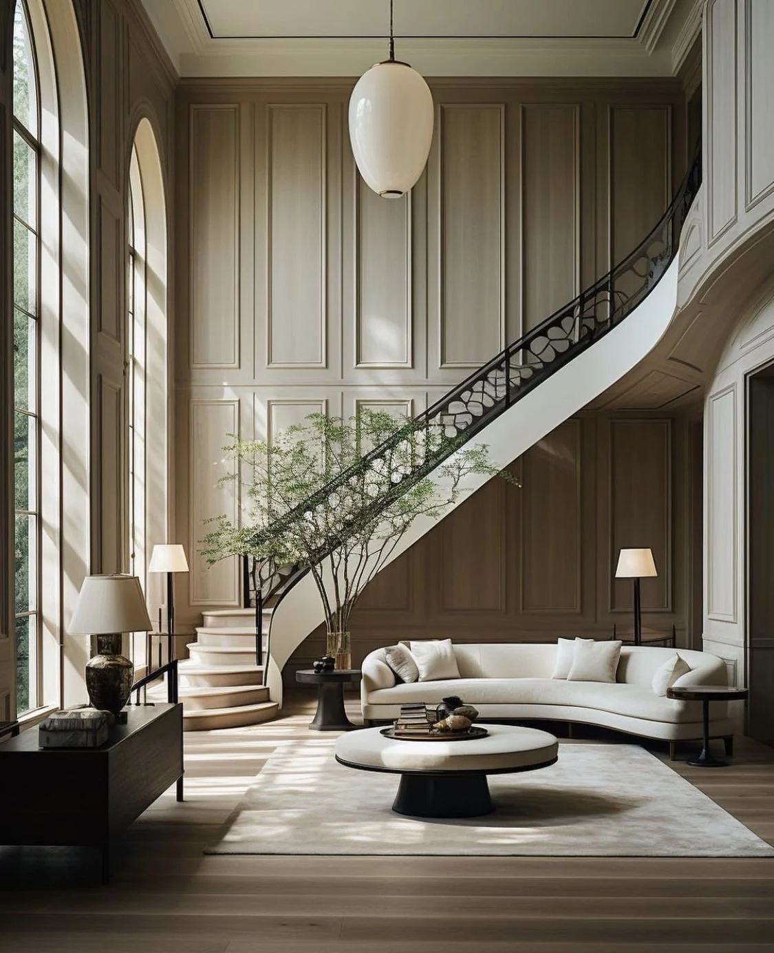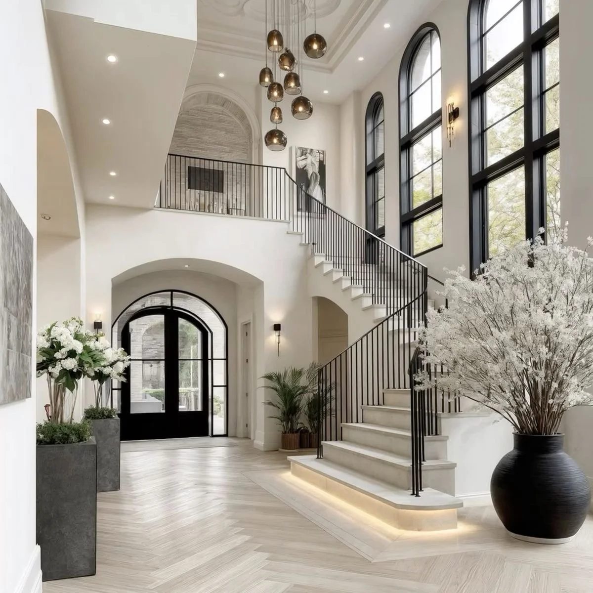 Who doesn’t love wide plank herringbone wood floors and arched cased openings and dramatic two-story ceilings with equally dramatic and stunning windows + doors? I mean what is there not to love??? The curated lighting meets the intricate details of the railing as well as the treads and the risers with the dope ceiling details down to the potted plants and simplicity of the neutral color palette. This is one of many sensational interiors we will explore together….lovely, right?