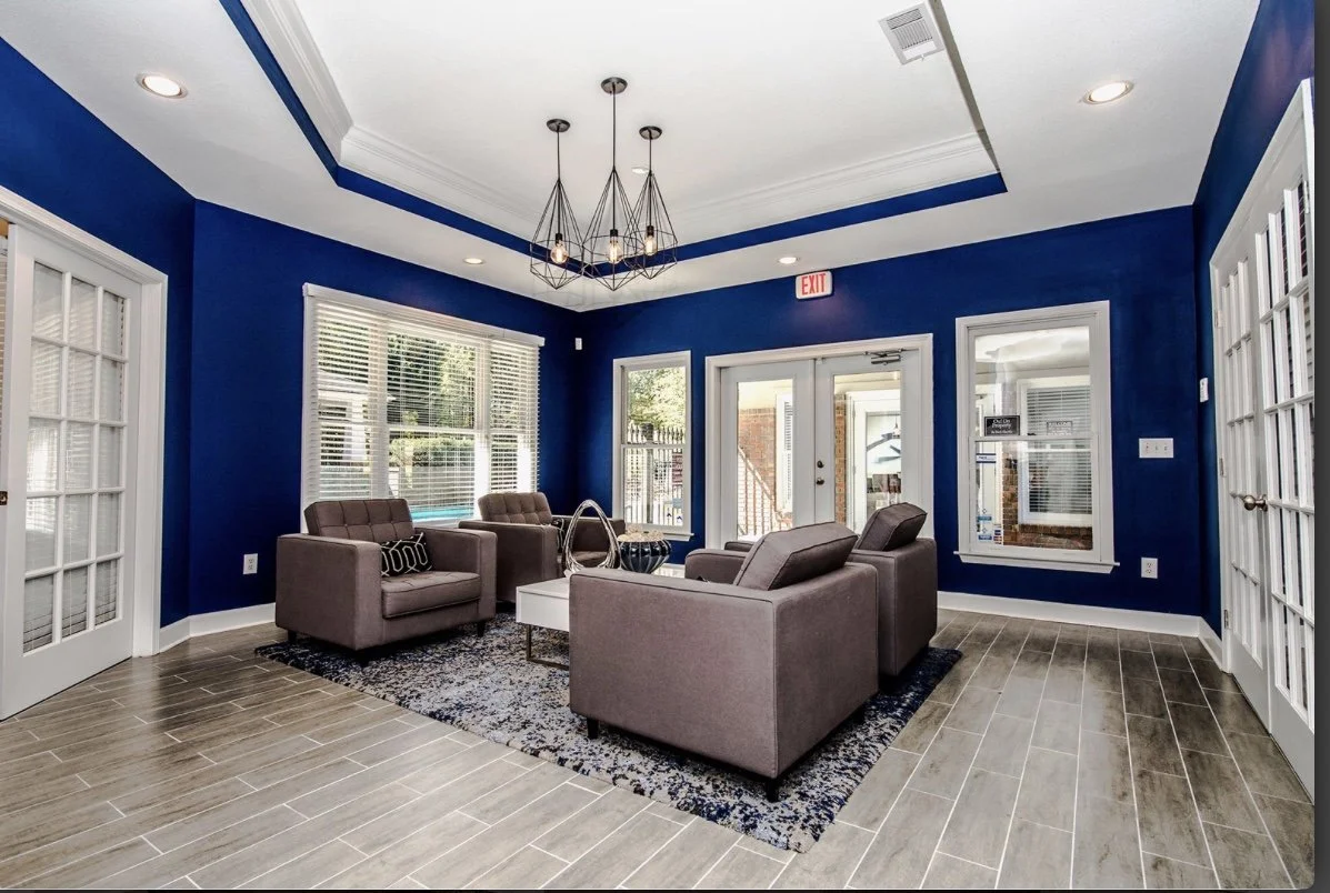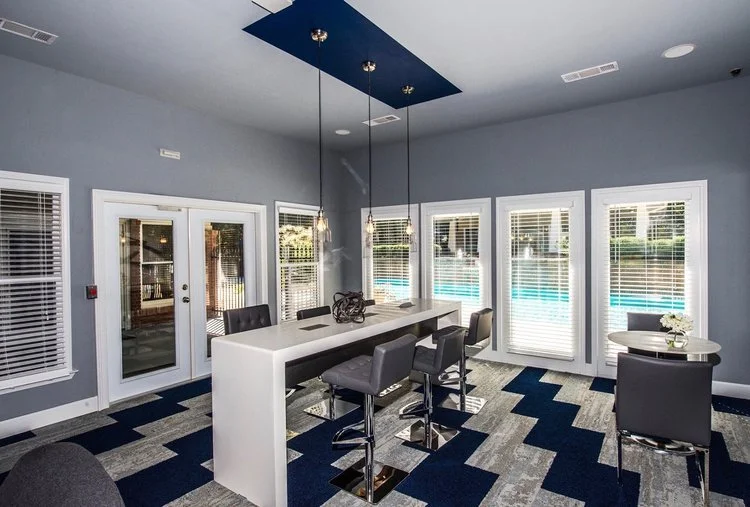 Bold design is not something to shy away from, it’s something to embrace and expand upon. The thoughtful approach of moody blues with bright whites grounded by shades of gray allows for a balanced yet refined aesthetic in this clubhouse.