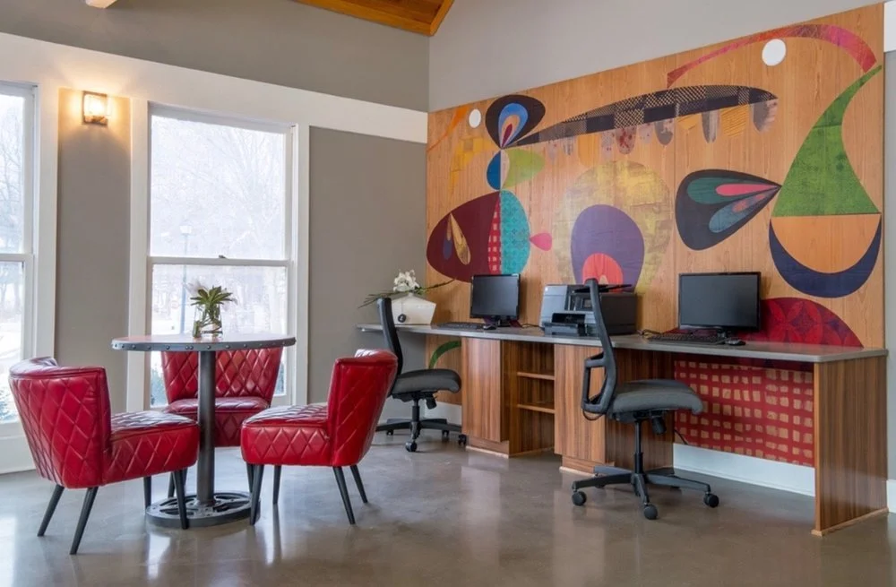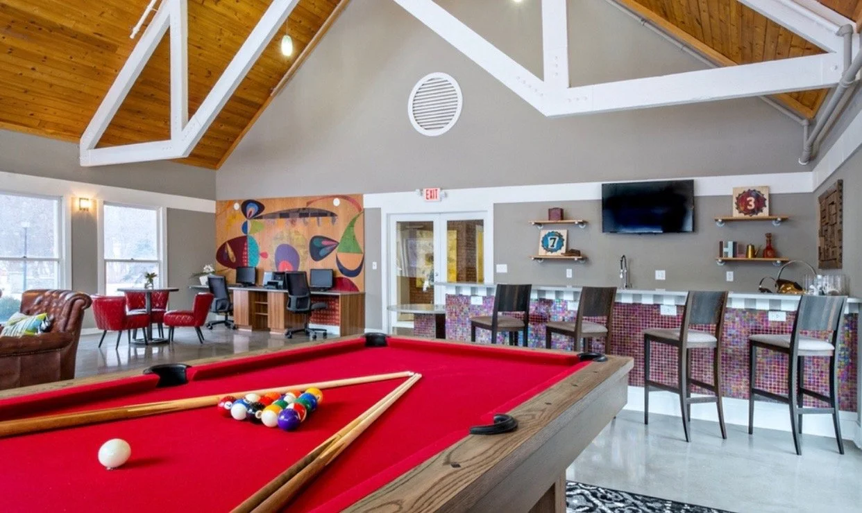 Our clients desired a playful, comfortable, but energetic space for their residents to enjoy during all four seasons. We thoroughly enjoyed using custom graphic panels to define spaces as well as utilizing color theory to liven up the clubhouse. This space allows you to gather for a cocktail or snuggle in one of the club chairs by the fireplace to read a novel or enjoy a game or two in a lighthearted but polished way.